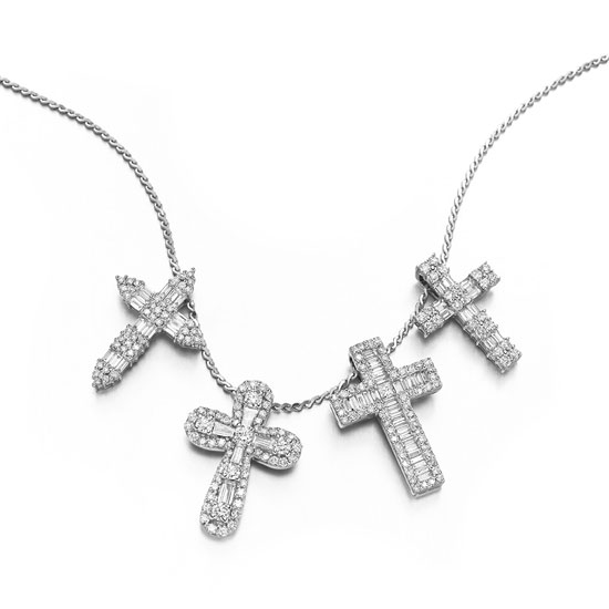 This is a gorgeous pendant that is made of 18-karat white gold and shimmers with a highly glossy finish. The appealing cross-shaped ornaments are adorned with shimmering diamonds. This fashionable pendant is easy to mix and match with your outfit.
