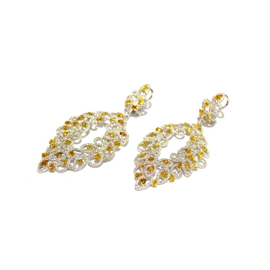 This pair of earrings appeals to ladies instantly with its beautiful and stunning appearance. Each piece features an 18K white gold mounting which is paved with sparkling diamonds. The earrings are also adorned with natural yellow diamonds for a more attractive look.
