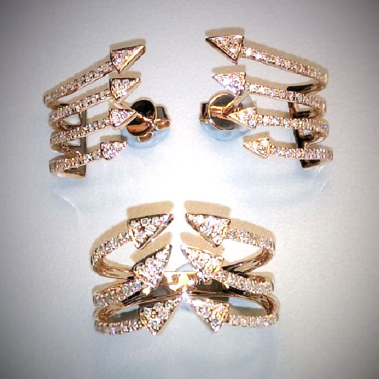 This gorgeous earrings and ring set is perfect for a sophisticated look. The design of multiple arrows can nicely showcase your unique character. Sparkling diamonds are delicately set in 14K rose gold for a luxurious flair.