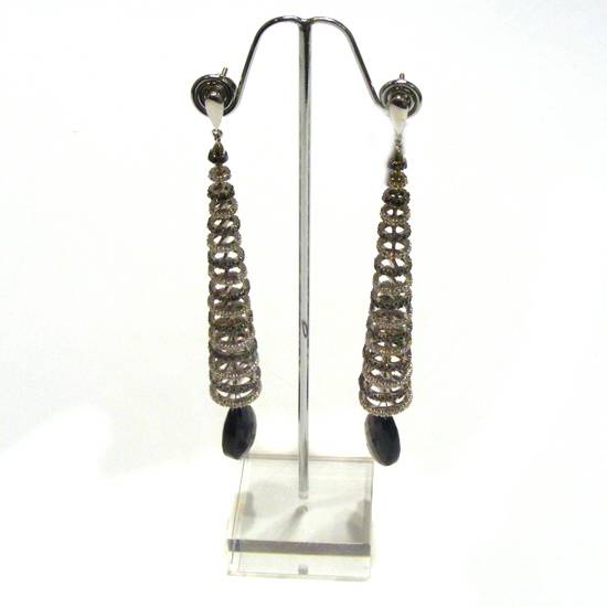 This is a pair of black and white diamond earrings. Each of the earrings features a spircal tower, set with black and white diamonds on alternate rings, attached to an onxy at the bottom. They are suitable for sensitive skin.