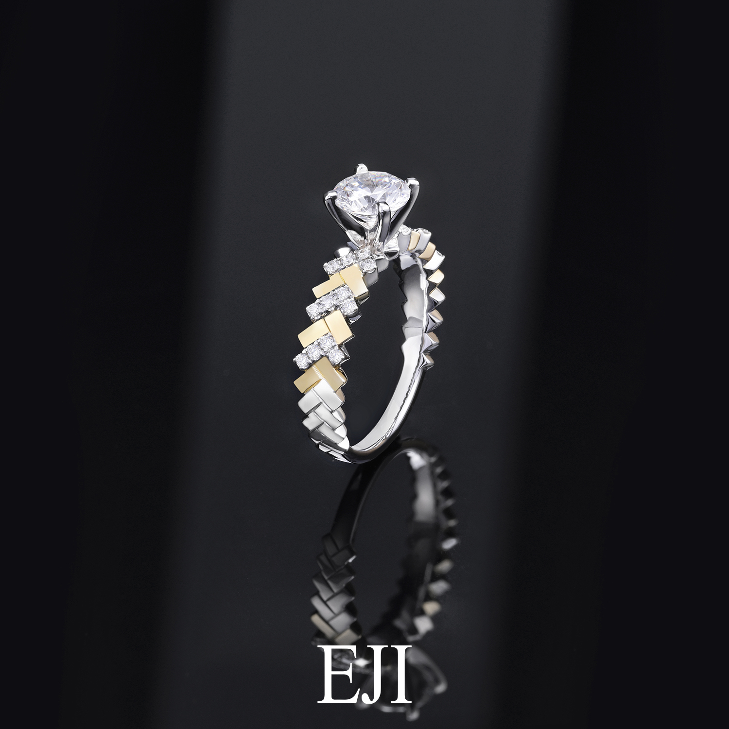 Modern elegance meets architectural sophistication in this striking 18K two-tone engagement ring. Expertly crafted in a combination of white and yellow gold, the ring band features a bold and innovative band design inspired by geometric patterns, offering a fresh and contemporary twist on a bridal classic.