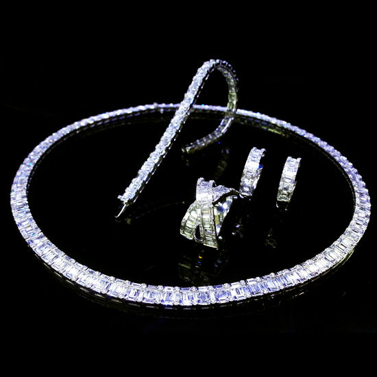 This is a fabulous jewelry set featuring a necklace, a bracelet, a ring and a pair of earrings. Delicately crafted with 18K white gold, the dazzling jewelry pieces are all accented with spectacular baguette diamonds. The glamorous set will pair nicely with fetching evening gowns.