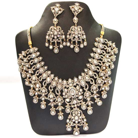 The diamond jewelry set includes a necklace and a pair of drop earrings. The extravagant design showcases a traditional accent. This diamond jewelry set is perfect for formal occasions such as weddings, banquets, parties, etc.