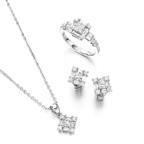 This jewelry set includes a pendant, a pair of earrings and a finger ring with a matching design. Each piece is accented with dazzling diamonds for a touch of luxuriousness. Made of 18-karat white gold, these jewelry pieces shimmer with a highly glossy finish.