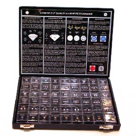 The items of this diamond master set are neatly placed in a rectangular-shaped case. It shows samples of different diamond cuts, colors and sizes. This master set offers good reference for diamond buyers.