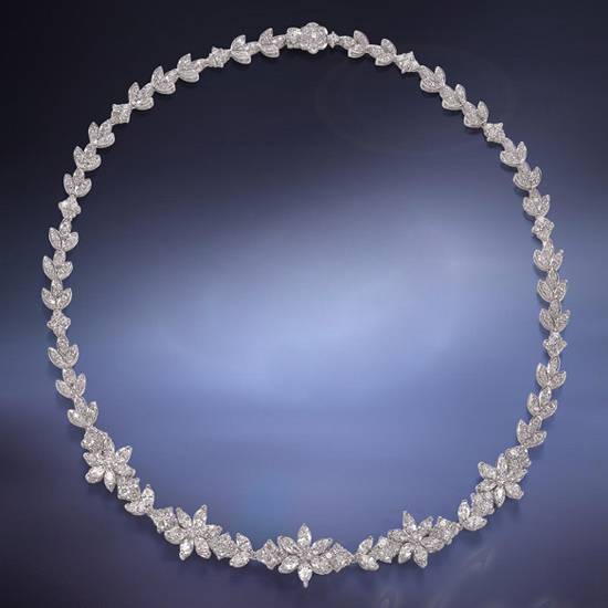 This stunning diamond necklace is a precious fine accessory for all formal occasions. The diamond necklace comes in a wreath design, with five flowers located near the center of the necklace. The shiny diamonds of the wreath necklace enhances its elegance.
