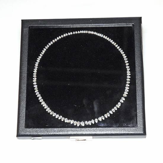 Features here is an ordinary design diamond necklace. Each diamond is shaped in pear shape. The necklace is nicely presented in a display box. It is ideal to be worn in any formal occasion.