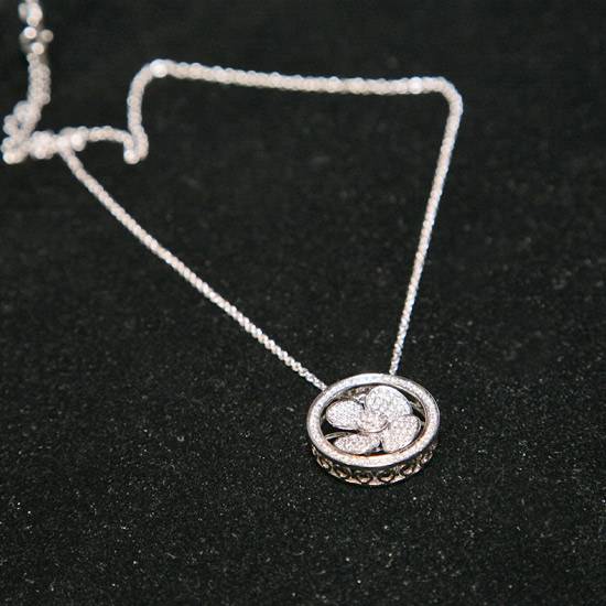This necklace features a flower pattern in the middle of the pendant. The flower is composed of diamonds, surrounded by a circle, also decorated with diamonds. The side of the circle consists of hollow heart-shaped patterns that are fully placed around the pendant. The faceted nature of the diamonds makes the whole piece sparkle amazingly.