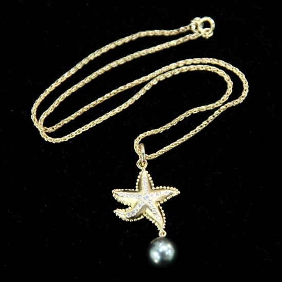 Shown here is an exquisite diamond necklace that has a stylish design. The necklace is made of 18K gold, embellished with diamonds on the pendant and a charming Tahiti pearl. Wear this excellent necklace for a unique touch of style.