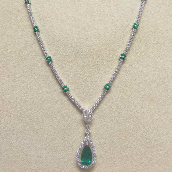 The twinkling necklace touts a glamorous and sophisticated design delicately embellished with luxurious diamonds and emeralds. The emerald pendant gives the necklace a touch of elegance with its graceful curve. The ravishing necklace surely glamorizes your evening gown.