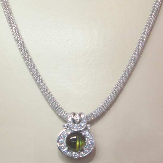 The alluring necklace showcases a classic and elegant setting featuring the cat's eye pendant. The cat's eye, in a graceful green color, delivers stunning shine. Further perfected by sparkling diamonds, the gorgeous necklace is ideal for complementing your fine jewelry collection.