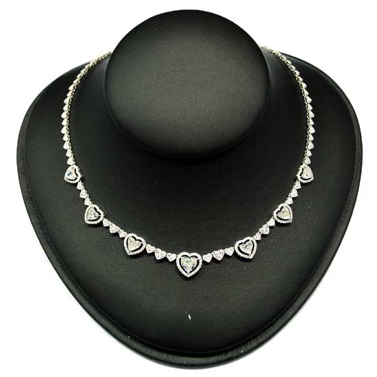 Pictured is a necklace kindly linked with shimmering hearts paved with diamonds. The necklace highlights H-colored diamonds to offer enviable gleams. Bring a touch of elegance to your look with this necklace.