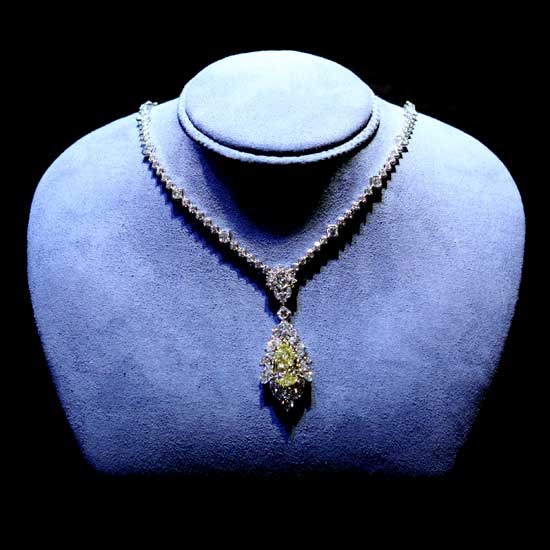 Displayed is a necklace with a foregrounding fancy yellow diamond in a pear cut. White diamonds of 12.83ct are mounted on the 18K gold construction. The gorgeous piece brings exquisiteness and style to your lonely neckline.