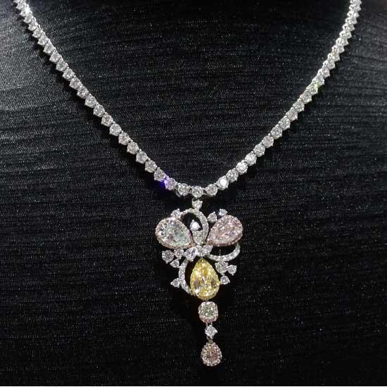 This is a necklace with an elegant and stunning design. Its 18K white gold chain is adorned with deluxe diamonds and the flowery pendant also consists of sparkling diamonds in assorted colors. Add glamor and charm to your evening look with this exquisite necklace.