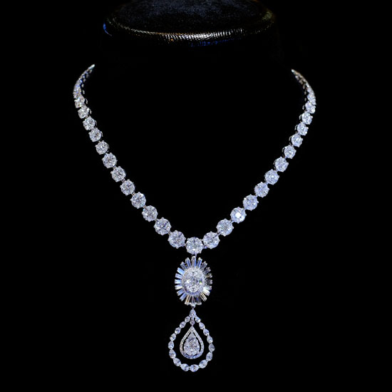 This is a necklace with a noble, elegant and deluxe design. It features a white gold mounting which is masterly adorned with assorted dazzling diamond stones. This dainty necklace is a perfect accessory for your high-fashion gown.