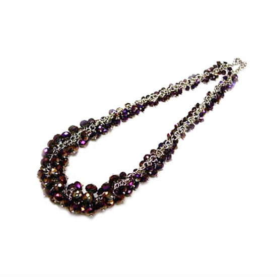 Displayed is a fashionable necklace constructed with purple diamond crystals. The multiple shimmering pieces form a crescent-shape main piece for a stunning look. Boasting delicate and extraordinary craftsmanship, this dashing jewelry necklace makes an alluring and elegant statement, especially when matching with party and formal attires.