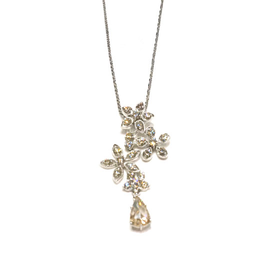 This diamond necklace shines with impeccable elegance. The five-petal flowers extend gracefully down your neck. You can pair this splendid necklace with a beautiful evening gown.