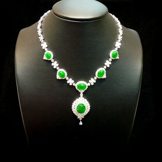 This is a well-designed necklace that comes with a fashionable, elegant and luxurious appearance. It is accented with loose diamonds and jadeite gemstones. This fashionable necklace pairs with your outfit nicely.