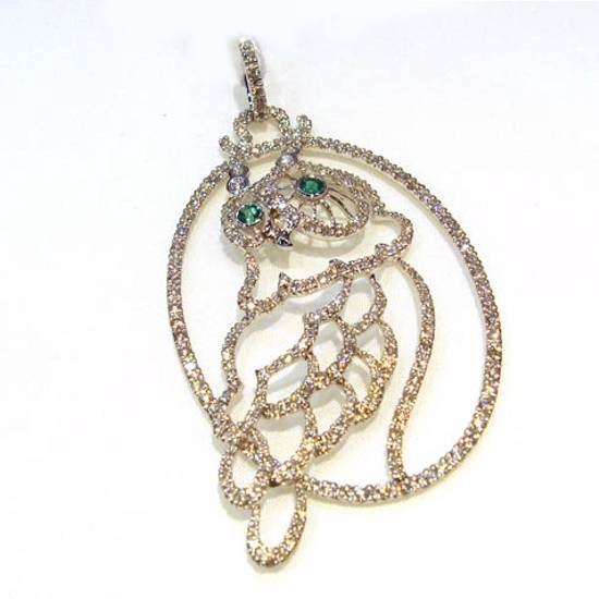 This is a diamond pendant with an owl motif. The flashing diamond owl design is sublimated with the two eye in a green precious stone in round brilliant cut. The owl sits in a dazzling diamond cage and radiates a lively mood.