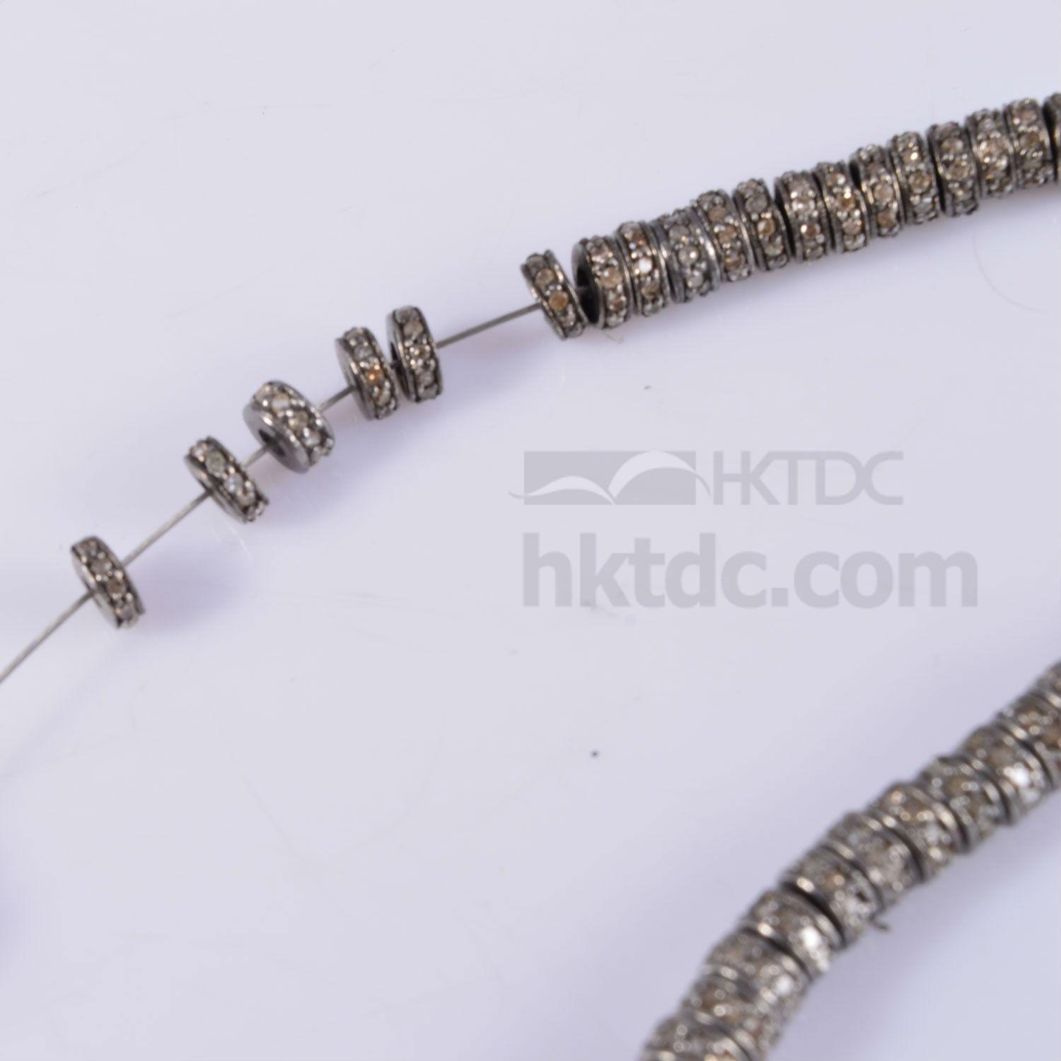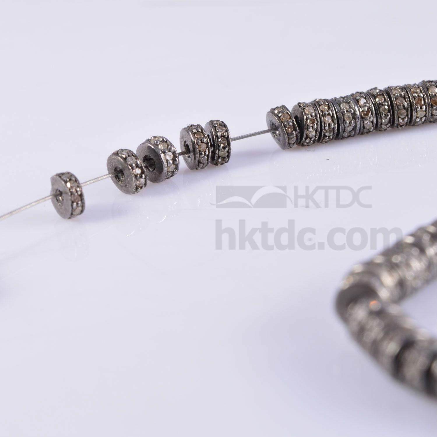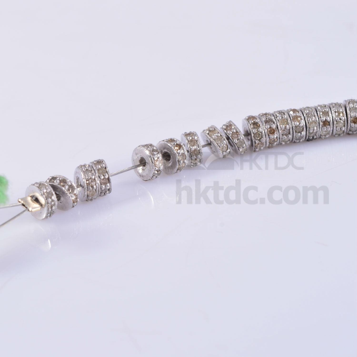 This is sterling silver diamond pave setting trye/spacer/bead used for designing purpose. You can create your own jewellery with these components. Size-4mm. We have beads and parts from 3mm to 20mm size and few even bigger. You can find uneven, tumble, round, spacer, tyre, polki beads. Studded with diamond and precious / semi precious stones.