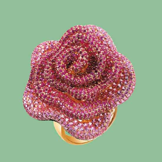 This beautiful ring flaunts a romantic rose-shape design to capture ladies' hearts. Dazzling red diamonds are paved all over the 3D bloom with attention to details. With a glittering golden band, this ring looks exceptionally alluring.