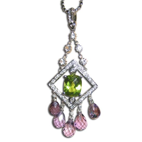 This is a pendant decorated with white diamonds, sapphire and periodots. The pendant is of drop pendant design and with 18K white gold casing.