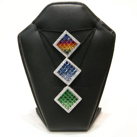 These pendants feature fancy sapphires and diamonds, orderly presented in rhombuses. On each piece, a rhombus, with its rim decorated fully with diamonds, contains faceted sapphires of blue, green, red, yellow, orange etc. The sapphires are so regularly displayed that they demonstrate an organized picture.