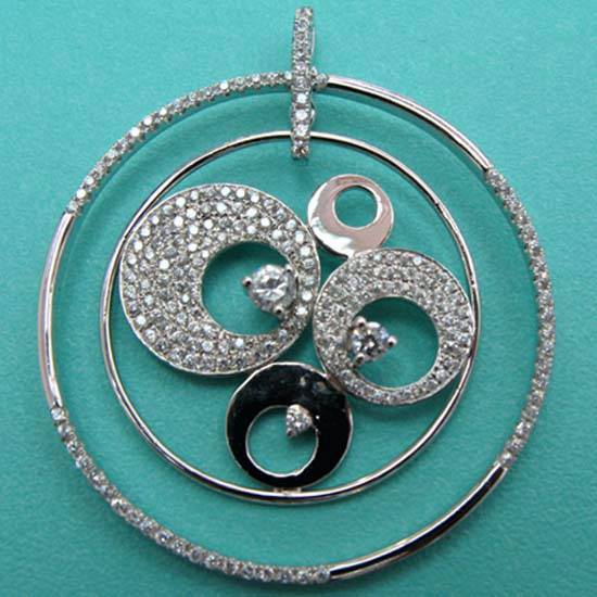 The precious pendant flaunts a circular design. The twinkling diamonds define the true meaning of elegance and class. This admirable diamond pendant matches flawlessly with silvery cords, completing your grand appearance with ease.