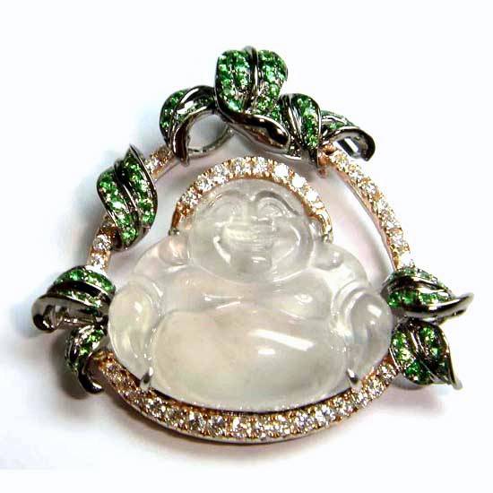 This beautiful pendant features an 18K white gold and rose gold construction with a Buddha design. It comes with white diamonds, white jade and green garnets all over. This gorgeous pendant is suitable for special occasions.