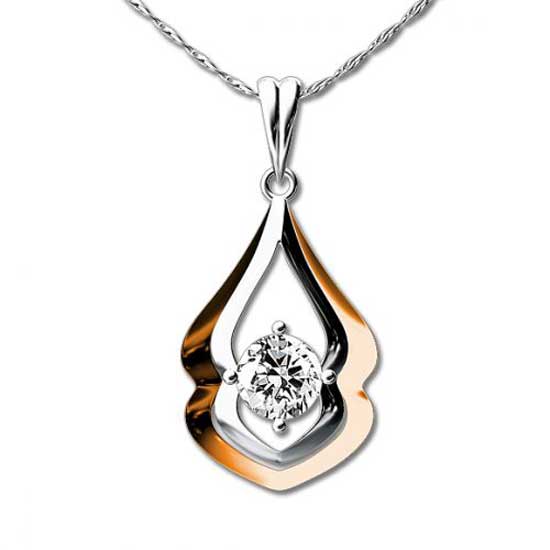 This diamond pendant flaunts a two-tone design that is hardly paralleled. It features a unique drop shape in glossy exquisite finishing, set along with a round faceted diamond in elegant prong support. This unique pendant simply distinguishes a lady from the crowd.
