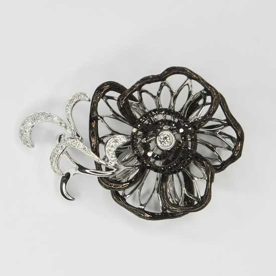 Presented is a diamond pendant in a floral-shaped design. It is composed of exquisite silver and black strips for a truly elegant style. The black and white diamonds at the center and scrolling vines add glamor to the entire piece.