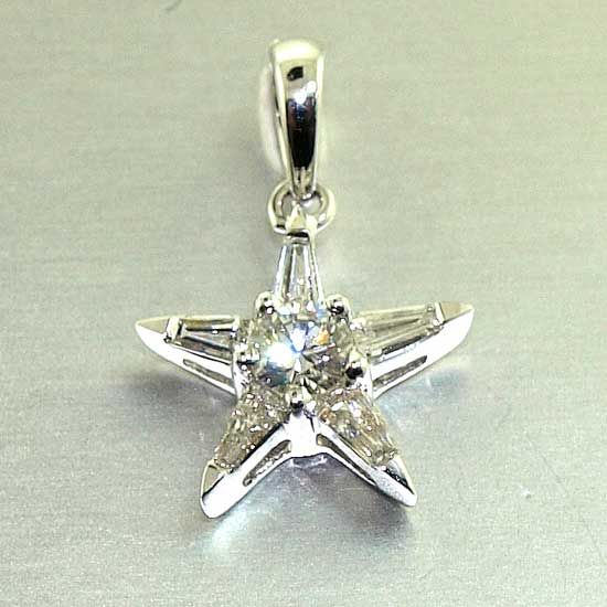 The delicate pendant comes in star-shape construction. It is encompassed with a round diamond in the center and 5 pieces of tapered diamonds on the edges. This pendant will surely give a stylish appeal to your look.