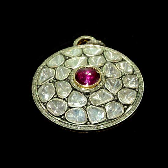 The exquisite round pendant is pressed with white rose-cut diamonds. It is encrusted with a round ruby stone in the center for a decorative touch. This pendant adds an exotic touch to your outfit.