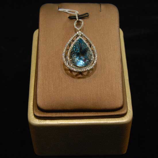 This elegant pendant highlights a pear-shaped aquamarine at the center. The pendant flaunts fine construction of 18k white gold and gleaming icy diamonds. The pendant compliments your evening look with a low-profile elegance.