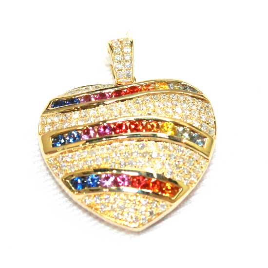 This heart-shaped pendant is encrusted with gleaming diamonds and fancy sapphires. It is entirely made in Hong Kong for reliable quality. This lovely pendant is sure to grace your neckline in style and sparkles.