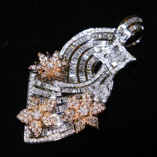Presented is a ladies’ pendant designed in a delicate curvy shape. Flower-shaped adornments set in rose gold look exceptionally eye-catching on the white gold setting. Dazzling diamonds of various cuts are set all over the surface to showcase a classy style.