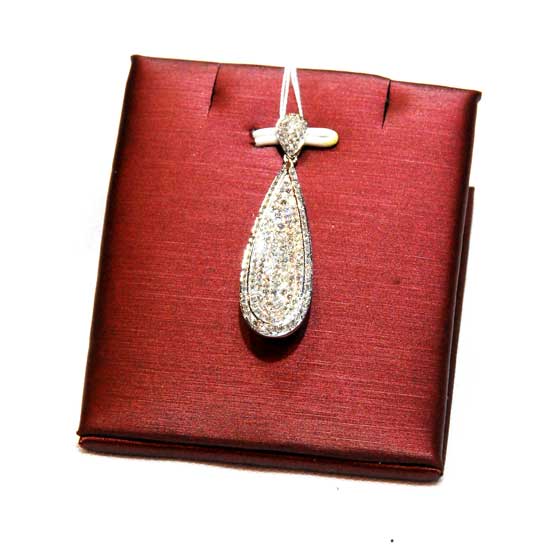The featured pendant is designed in a graceful raindrop shape. The surface is paved with loose diamonds to show spectacular dazzle. This exquisite pendant complements any looks for formal occasions.