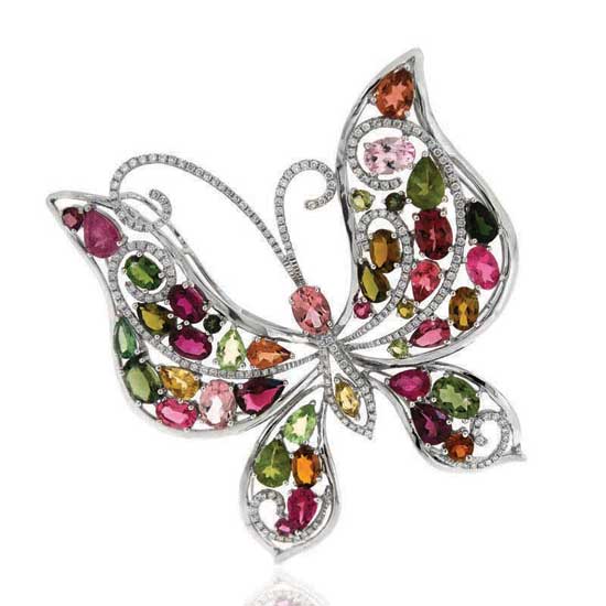 This featured pendant is well designed in a butterfly’s shape. The butterfly is finely crafted with exquisite white gold, loose diamonds and colorful tourmalines. The careful arrangement of gemstones ensures a captivating, artistic picture.