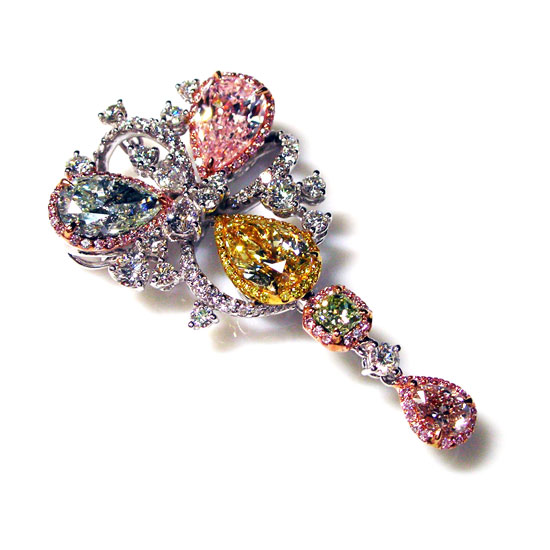 Photographed is a fancy pendant assembled with colored diamonds of different sizes and cuts. The dainty pendant gives enviable sparkles and delightful noble colors. The dangling pendant surely makes a to-die-for accessory to dress your neckline.