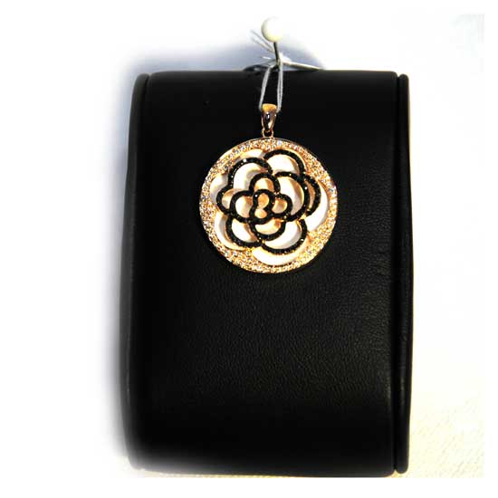 This dainty 18K rose gold pendant is well set with a white agate stone. Embellished with black and white diamonds around the floral pattern, this pictured pendant presents a beautifully dainty aura. This diamond pendant matches your elegant outfits very well.