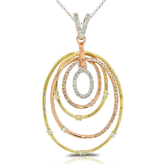 This is a diamond pendant with a galaxy-like appearance. It is made of white, yellow and rose gold for a touch of uniqueness. The pendant is also paved with diamond elements for enhanced charm.