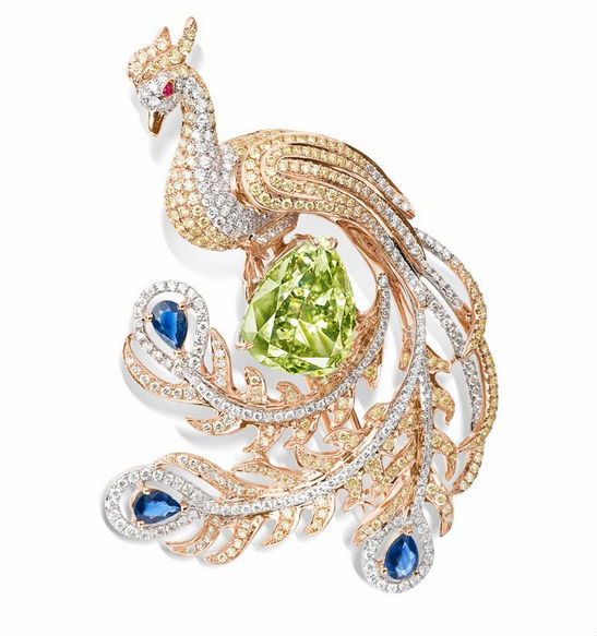 This stylish pendant comes with a peacock design for a fashionable look. It is crafted with dazzling fancy diamonds, blue sapphires and colored stones for an elegant touch. This diamond pendant will surely make you stand out from the crowd. Main stone weight: 14.03ct. Diamond color: fancy grayish yellowish green. Clarity: SI2. Certificate: GIA2176354841. Side stones: 253 round stones: 1.99ct/284 fancy diamonds: 2.61ct/3 blue sapphires: 1.32ct/1 ruby: 0.01ct.