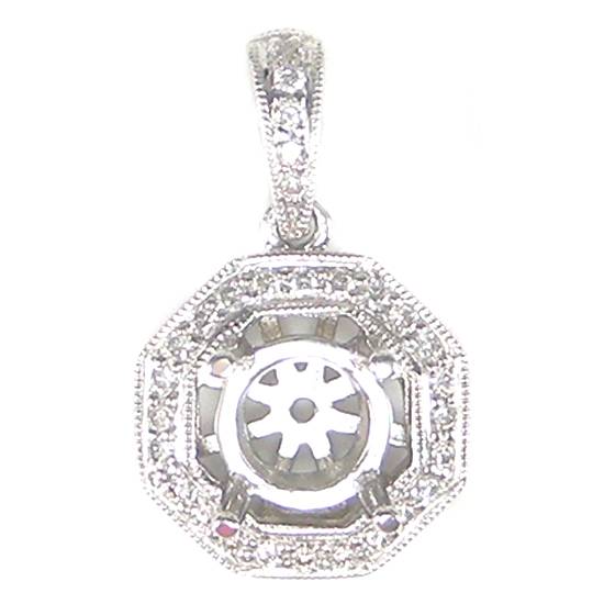 This is a 18K white gold diamond pendant setting. It features a round setting with four prongs for round stone about 65mm. The surrounding octagon is decorated with multiple small round white diamonds.