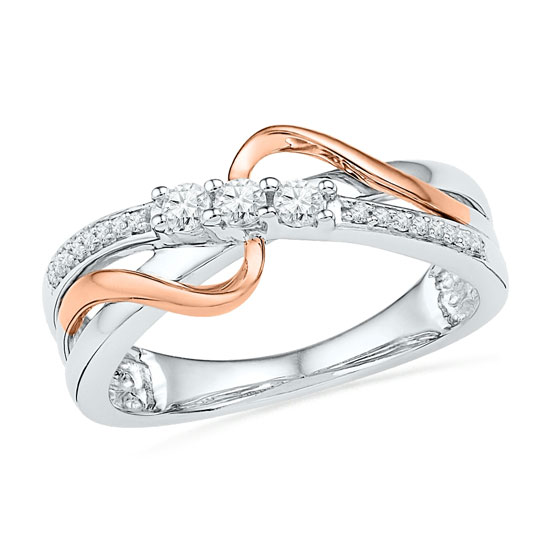 This flattering ring is delicately crafted with both white gold and rose gold. The multi-layered shank is detailed with 0.20 carats of diamonds for a luxurious touch. This graceful and fashionable ring is great for unique occasions such as holiday, anniversary, parties, etc.