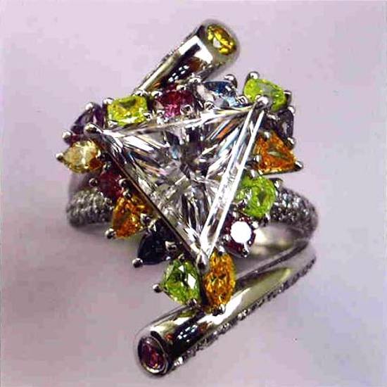 • Diamond has a brilliant fancy cut in a triangle shape.
