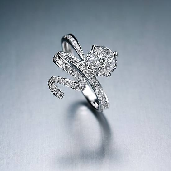 This is a diamond channel set ring with an elegant design. The ring is closed with a flying ribbon pattern which adds motion and sense of youth to the ring. The diamonds run all way round the ring. Besides, it features with a large diamond opposite the ribbon pattern set in four prongs. The ring is dazzling, which it can be worn alone or mix and match with other accessories.