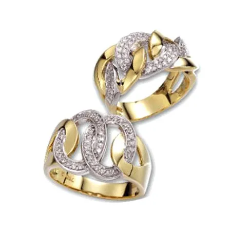 These are two 18k yellow gold diamond rings. Both rings are designed with a link chain pattern. Multiple small round white diamonds are set in 18k white gold.