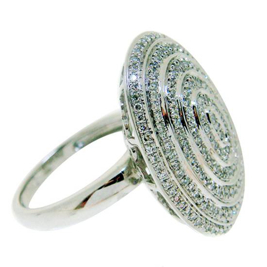 This is a 18k white gold diamond ring. The oval fashion ring is designed with small white diamonds set in a pattern of concentric circles.
