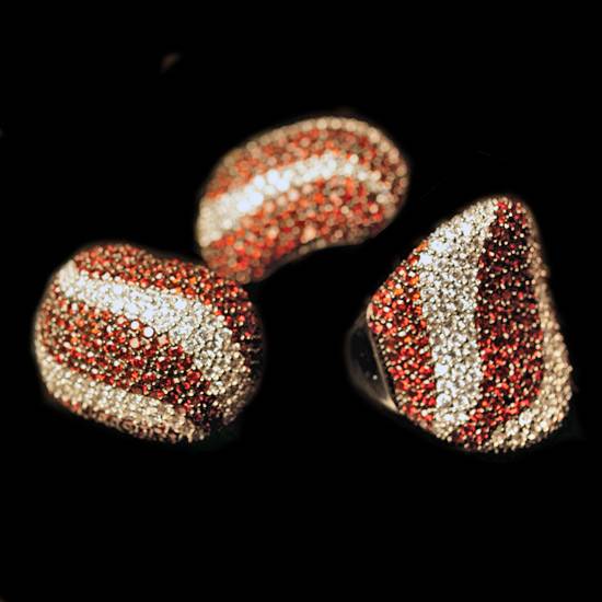 These are ring decorated with white diamonds and red coloured gemstones in pave setting. The ring are made with carat white gold and availabl in various sizes.