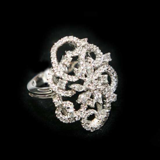 This ring forms an irregular pattern, in which diamonds are found. The lines on which the diamonds are placed are in a scroll pattern, presenting a seemingly flower outlook. The sparkling diamonds are one of the biggest selling points of this ring, as they demonstrate the ultimate elegance of the piece.